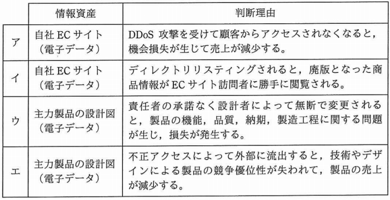 IPA“中小企業の情報セキュリティ対策ガイドライン (第2.1版)”を参考に, 次の表に基づいて, 情報資産の機密性を評価した。 機密性が評価値2とされた情報資産とその判断理由として, 最も適切な組みはどれか。
